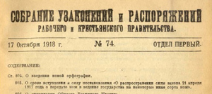 23 декабря 1917 /5 января 1918 года в России была введена новая орфография. Всем правительственным и государственным изданиям предписывалось с 1 (14) января 1918 г. «печататься согласно новому правописанию», а школам внести соответствующие изменения в обучение грамоте. -