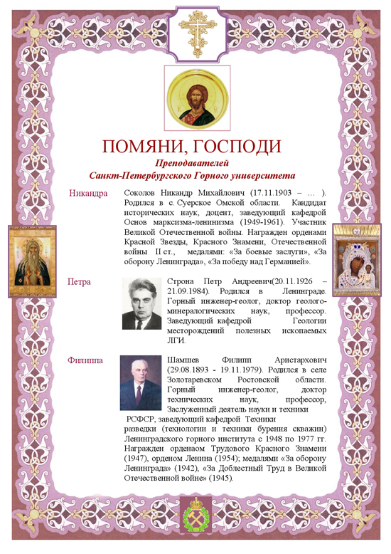 22 ноября, в среду настоятель Князь-Владимирского собора протоиерей Владимир Сорокин совершил молебен и литию в храме прп. Макария Египетского в Горном университете. За богослужениями молились студенты и сотрудники Горного университета, пел молодежный студенческий хор. Поддерживая установившуюся добрую традицию, в этот день в храме молились о начальствующих, преподавателях, студентах и сотрудниках Горного университета. Особо в храме прп. Макария молились о тех, чьи дни памяти приходятся на 3-ю неделю ноября. Многие из них оставили о себе благодарную память и вошли в историю Горного университета.